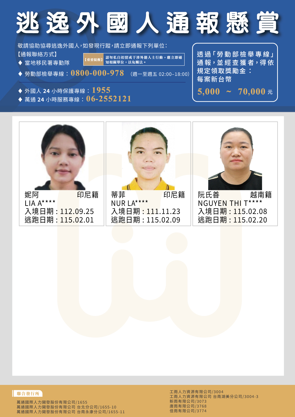 2026年02月 外國人逃逸公報